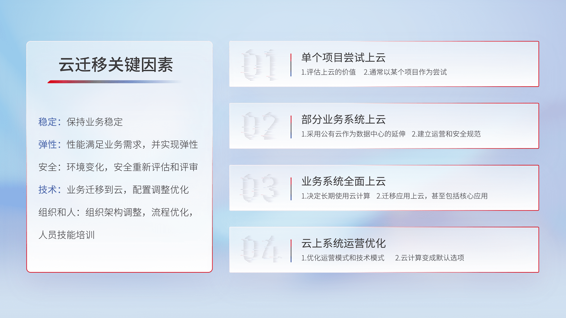 结合实际业务,,从规划设计、、、、云平台选型、、云原生改造、、、数据迁移、、、集成交付,,,,迁移全过程为客户识别最佳上云路径,,,做好风险识别管理,,设计网络架构、、、身份权限、、安全审计合规、、、操作审计、、、日志审计、、监控告警策略、、、多站点容灾设计等,,,对云上基础设施进行整体规划,,,,提升IT治理水平,,,,以满足弹性、、、、高可用、、、高性能的需求。。。。