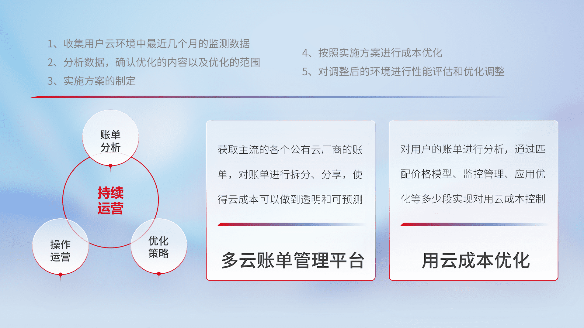 通过多云纳管,,,,以统一的资源数据模型把客户的云资源进行抽象和封装,,,,进而实现对多云资源的统一操作,,保障云资源管理的可靠性、、、、稳定性与可用性。。量身定制化运维内容,,,,配置、、、、开发运维、、、、补丁管理、、、备份、、监控、、认证和访问管理、、、审计和日常巡检等,,,,保障在用云过程中的可靠度,,稳定度以及高可用率。。。。